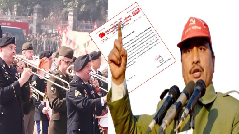 काठमाडौँ । नेपाल कम्युनिस्ट पार्टी (माओवादी) ले सेना दिवसको अवसरमा काठमाडौँको सैनिक मञ्च टुँडिखेलमा अमेरिकी सेनालाई परेडमा सहभागी गराएकोमा आपत्ति जनाएको छ । सो पार्टीका महासचिव विप्लव सीले सोमबार एक विज्ञप्ति जारी गर्दै नेपाली जनता र राजनीतिक दलहरूको सहमति बिना…
