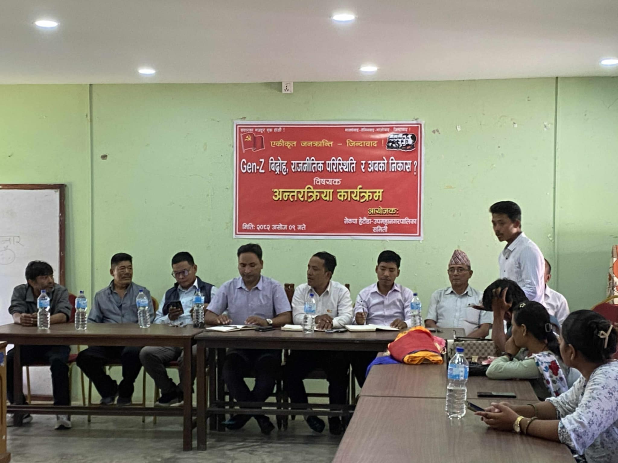जिल्ला सचिवालय सदस्य सुर्य सीले सन्चालन गरेका जेन्जी विद्रोह, राजनीतिक परिस्थिति र अबको निकास विषयक अन्तरक्रिया कार्यक्रमको सभाध्यक्ष नेकपा हेटौंडा उपमहानगरपालिका इन्चार्ज विवेक सी रहेका छन् ।