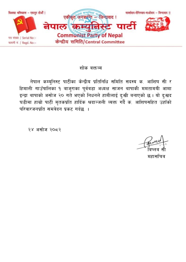 नेपाल कम्युनिस्ट पार्टीले पार्टीका केन्द्रीय प्रतिनिधि समिति सदस्य आशिष सी र हिमाली गाउँपालिका १ बाजुराका पूर्व वडा अध्यक्ष साजन थापाकी ममतामयी आमा इन्द्रा थापाको निधनप्रति दुःख व्यक्त गरेको छ ।