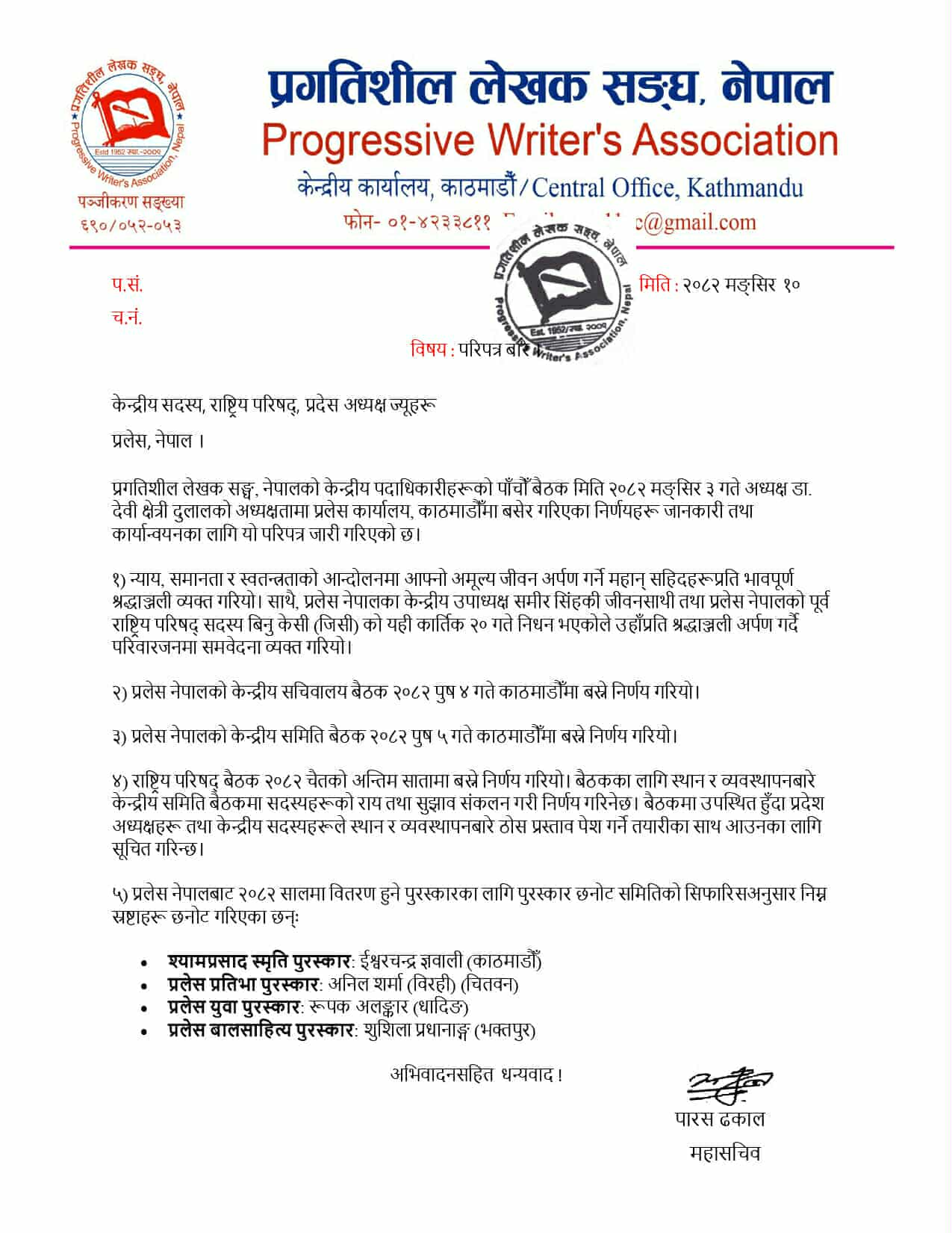 बैठकमा प्रगतिशील लेखक संघका अध्यक्ष, महासचिव तथा पदाधिकारीहरूले साहित्यका विविध विधामा सक्रिय सिर्जनाकारहरूलाई सम्मानित गर्दै प्रगतिशील सांस्कृतिक आन्दोलनलाई अझ सुदृढ बनाउन पुरस्कार वितरण निरन्तर जारी रहने बताएका थिए ।