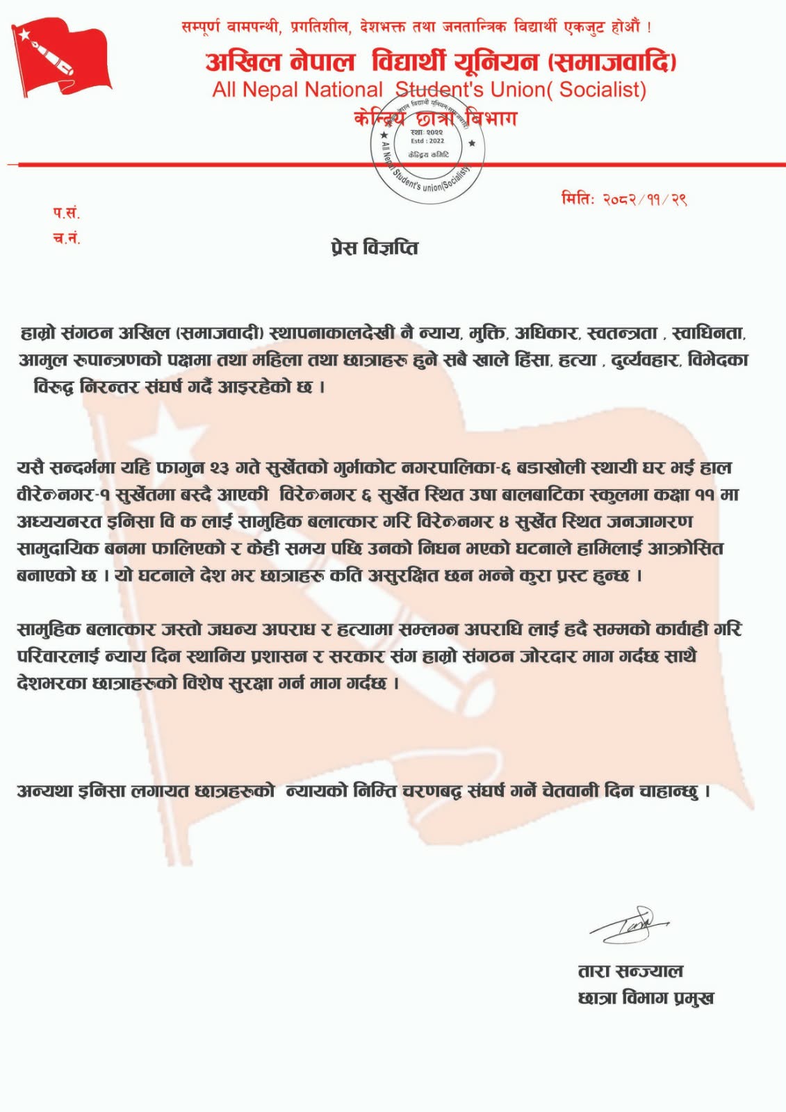 यसै सन्दर्भमा यहि फागुन २३ गते सुर्खेतको गुर्भाकोट नगरपालिका–६ बडाखोली स्थायी घर भई हाल वीरेन्द्रनगर–१ सुर्खेतमा बस्दै आएकी विरेन्द्रनगर ६ सुर्खेत स्थित उषा बालबाटिका स्कुलमा कक्षा ११ मा अध्ययनरत इनिसा विकलाई सामुहिक बलात्कार गरि विरेन्द्रनगर ४ सुर्खेत स्थित जनजागरण सामुदायिक बनमा फालिएको र केही समयपछि उनको निधन भएको घटनाले हामीलाई आक्रोसित बनाएको छ । यो घटनाले देशभर छात्राहरु कति असुरक्षित छन् भन्ने कुरा प्रष्ट हुन्छ । सामुहिक बलात्कार जस्तो जघन्य अपराध र हत्यामा सम्लग्न अपराधीलाई हदै सम्मको कार्वाही गरि परिवारलाई न्याय दिन स्थानिय प्रशासन र सरकारसंग हाम्रो संगठन जोडदार माग गर्दछ । साथै देशभरका छात्राहरुको विशेष सुरक्षा गर्न माग गर्दछ ।अन्यथा इनिसा लगायत छात्राहरुको न्यायको निम्ति चरणबद्ध संघर्ष गर्ने चेतवानी दिन चाहन्छु ।